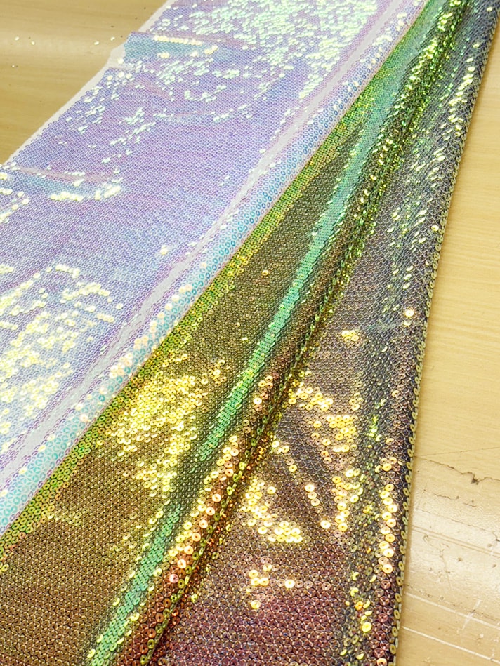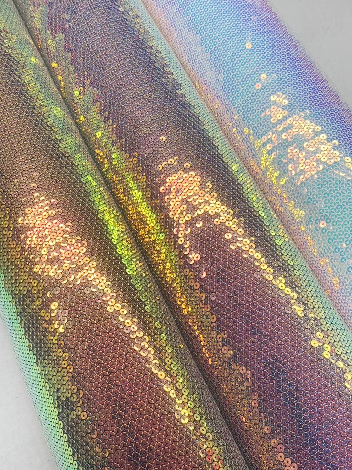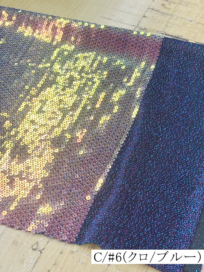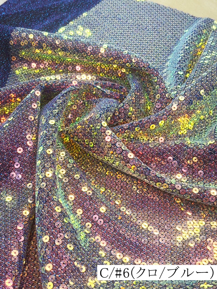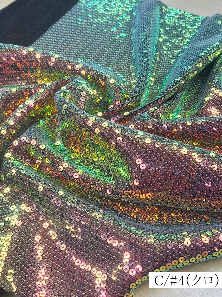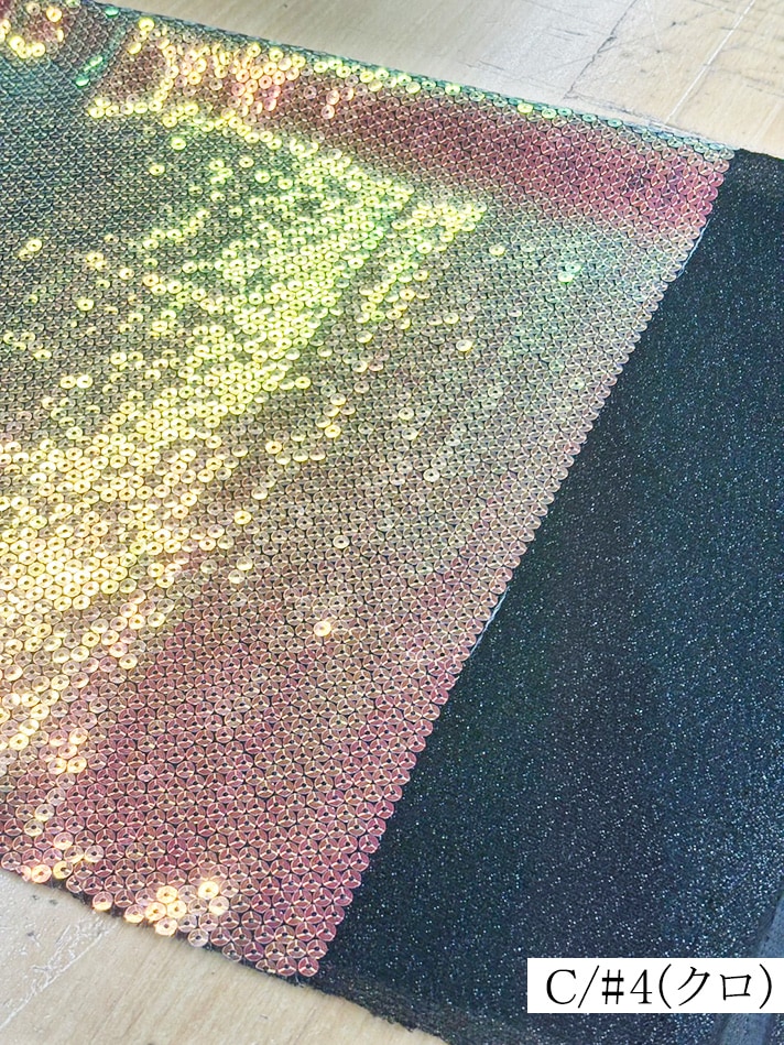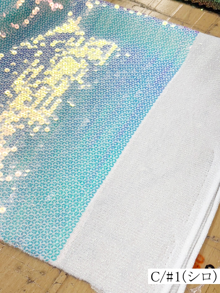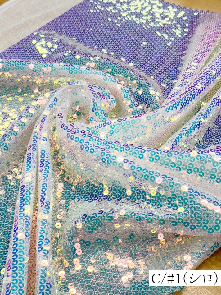 横ストレッチのラメニットに5mmのオーロラスパンコールを縫い付けた生地です。白は透け感があります。